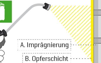 1. Semi-Permanenter Graffiti-Schutz (A. Imprägnierung und B. Opferschicht) wird auf Untergrund aufgebracht.